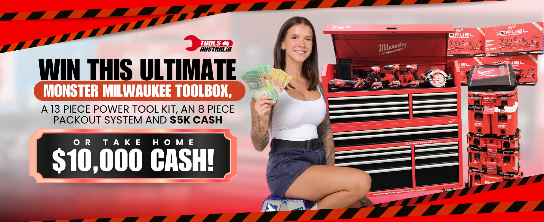 Milwaukee 18V FUEL™ power tools, REDLITHIUM™ battery ecosystem, Milwaukee PACKOUT™ 6pc modular storage system, and the Milwaukee 56" High Capacity Combination tool storage plus $5000 cash.